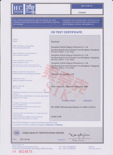• 中國質量中心 CB測試證書