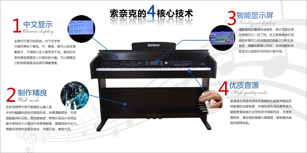 中山市小欖鎮名樂電子有限公司是一家專業從事電子樂器產品研發、生產、銷售服務于一體的高新技術企業。已獲得相關產品的3CCECB等認證。主要生產經營品牌索奈克(Sonic)電鋼琴和電子琴等。