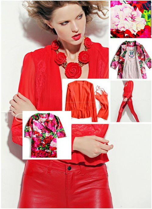 看慣了烈日下的清涼和夏季柔美的飄逸,一襲驚艷、純正的中國紅,加上呼之欲出、嬌艷欲滴的紅玫瑰,不得不說,這即是秋的信息,又是秋的時尚。設計理念大膽富有個性化,風格集冒險、色彩斑斕和吉普賽為一體,盡管是歐美范兒,卻也逃脫不了東方人追逐的眼光;凈色的模版,簡潔的風格以及麻豆動感的游走、媚惑的眼神,加之精心設計打造的玫瑰花項鏈的畫龍點睛。可以想象這樣的色彩與格調,專屬于搭配、情景與氛圍,一旦將其作為店鋪的主打商品置于首頁,即使不用文字,詩也早已成行;即使不用捉摸,香艷早已傳遞。