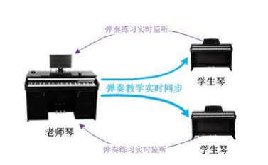 >老師琴的彈奏動作及音效能同步所有琴上,實現一對多的集體教學示范的功能;